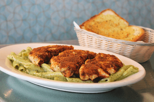 with penne noodles, alfredo sauce, and pesto sauce topped with blackened chicken